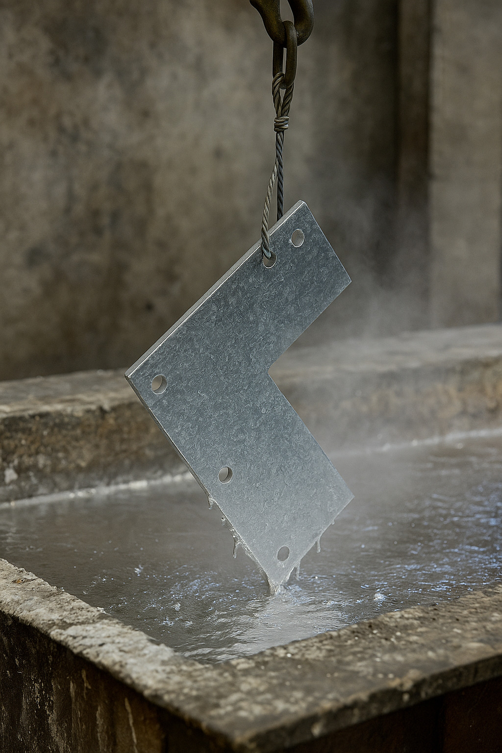 Изделие полностью погружается в ванну с расплавленным цинком температурой около 450 °C. При контакте с цинком на поверхности стали формируются прочные межметаллические соединения и защитный цинковый слой.