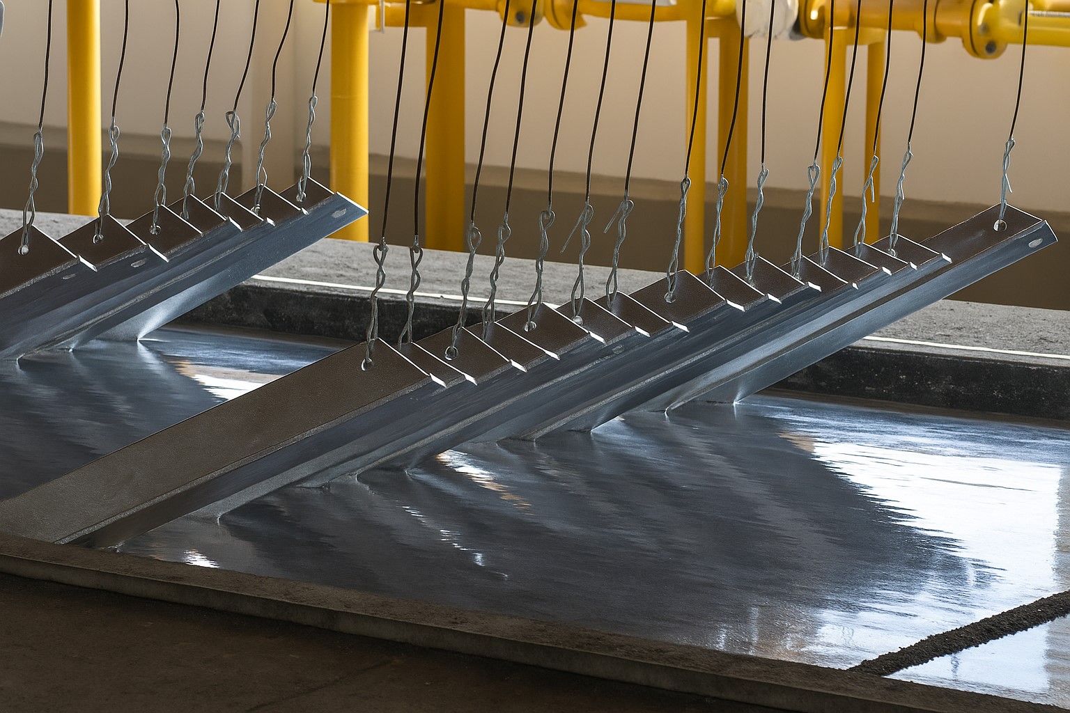 При горячем цинковании металл погружают в ванну с расплавленным цинком температурой около 450 °C. В результате образуется прочное многослойное покрытие из сплава цинка и железа, а сверху – чистого цинка. Цинковый слой прочно соединяется с основой (сталью) и не отслаивается при деформации.